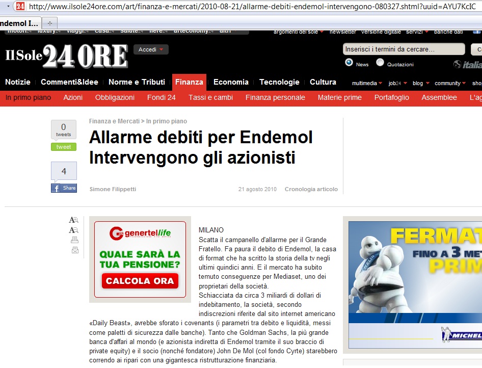 Il bello è che la Endemol stava attraversando un periodo di forte crisi, e questa trasmissione sembra studiata apposta per ridare fiato alla società, permetterle di conquistare un nuovo target, e assicurandole nuovi introiti. Già il 21 agosto il Sole 24 Ore infatti dava la notizia relativa a "circa 3 miliardi di dollari di indebitamento" della società Endemol, e successivamente ai primi di novembre sul Corriere della Sera leggiamo che "L’investimento in Endemol comincia a pesare a Cologno Monzese".